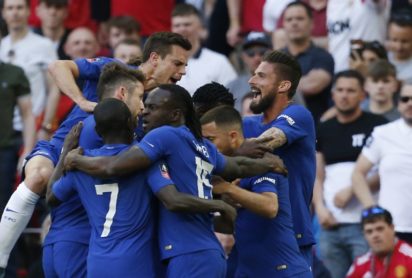 Chelsea’s Belgian midfielder Eden Hazard (R) celebrates with teammates after scoring during the English FA Cup final football match between Chelsea and Manchester United at Wembley stadium in London on May 19, 2018. / AFP PHOTO