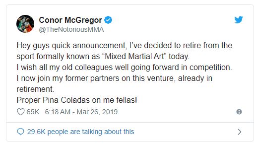 Conor McGregor, the controversial former UFC featherweight and lightweight champion, tweeted late Monday night that he has decided to retire from MMA. It’s possible McGregor wasn’t being serious, as you never really know with him.