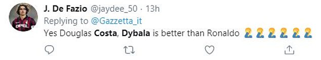 Supporters reacted with surprise by the Brazilian's claim, with one fan sarcastically saying: 'Yes Douglas Costa, Dybala is better than Ronaldo' before adding emojis to emphasise the point.