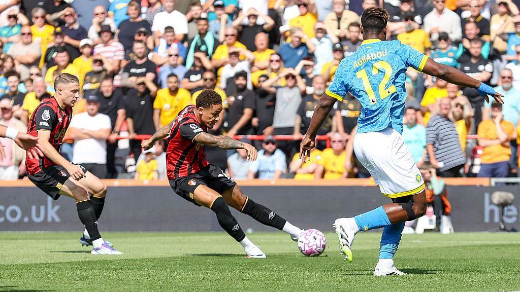 Jean-Ricner Bellegarde's poor pass on the edge of Wolves' area allowed Antoine Semenyo to pick out Tavernier, whose low shot took a wicked deflection off Emmanuel Agbadou before ending up in the net via the underside of the crossbar.